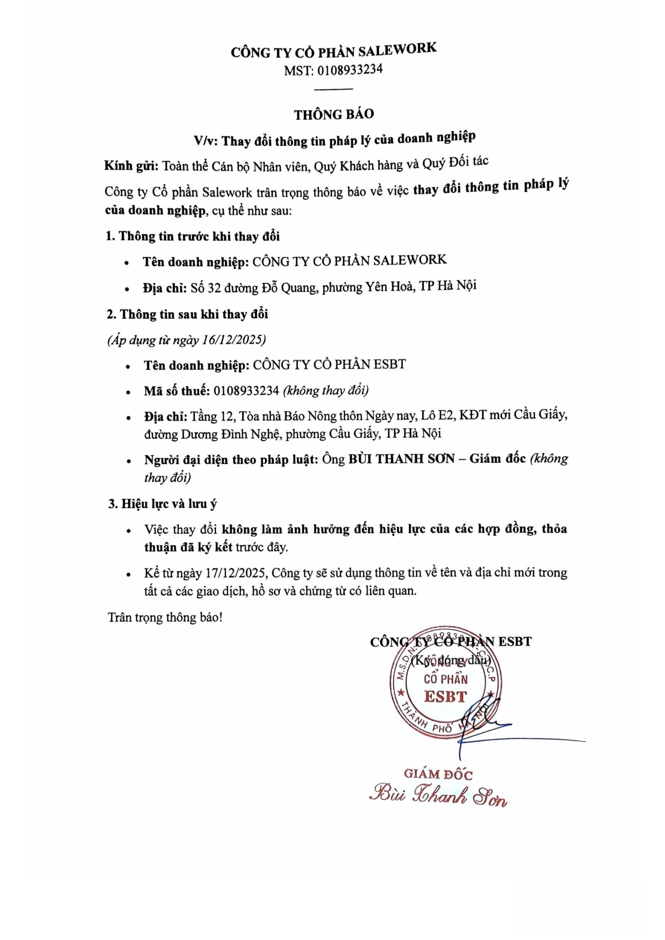 Kể từ ngày 17/12/2025, công ty sẽ sử dụng thông tin về tên và địa chỉ mới trong tất cả các giao dịch, hồ sơ, hợp đồng, hóa đơn, chứng từ, con dấu, danh thiếp và các thủ tục pháp lý có liên quan.